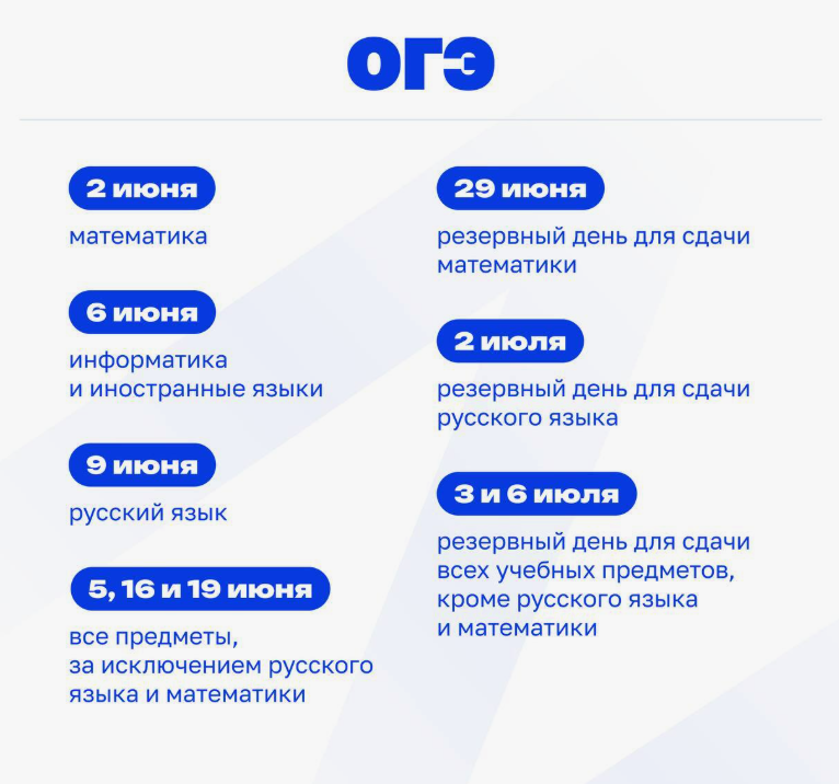 ОГЭ по всем учебным предметам начинается в 10.00 по местному времени. Продолжительность ОГЭ по математике и русскому языку составляет 3 часа 55 минут (235 минут). Допускается использование участниками экзаменов следующих средств обучения и воспитания по соответствующим учебным предметам: